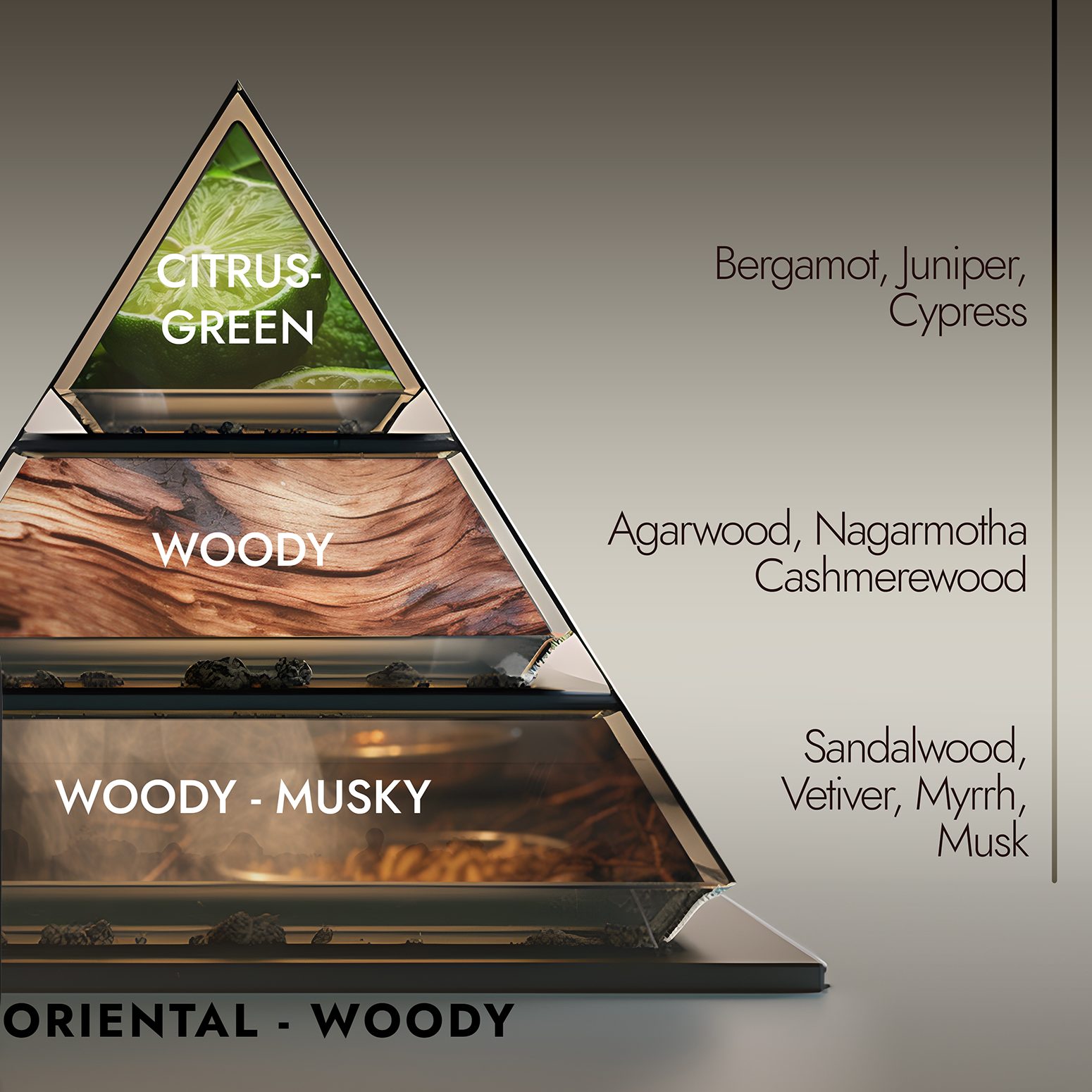 Vârful parfumului se deschide cu bergamotă, ienupăr si chiparos in timp ce in inima acestuia regăsim note lemnoase de agar, nagarmotha și lemn de cașmir. Baza este apoi închisă cu lemn de santal, vetiver, smirnă și mosc.