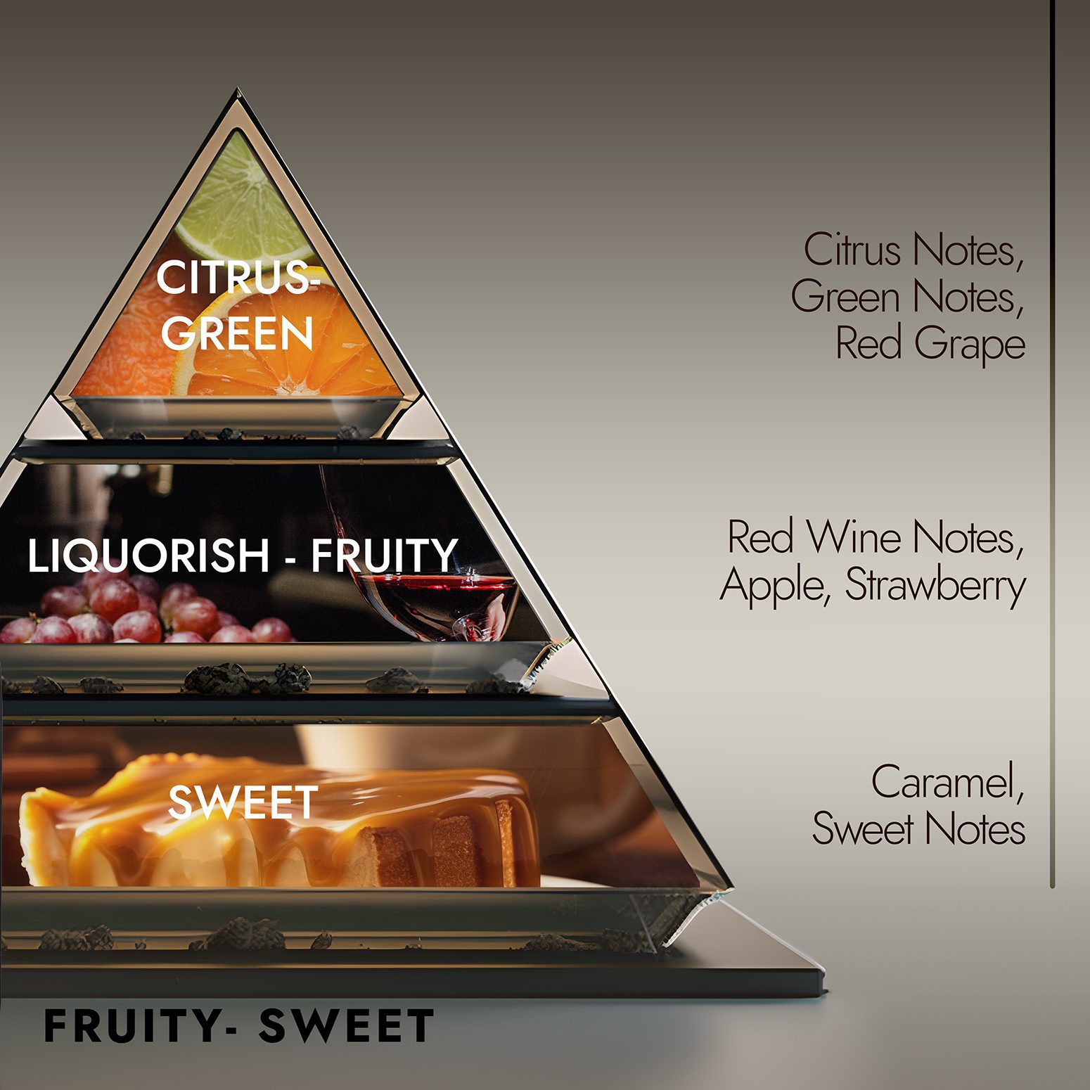 Marea deschidere este asigurată de note citrice, note verzi și struguri roșii. In inima parfumului regăsim notele aromate de vin roșu ce sunt acompaniate de note fructate de căpșuni și măr . Simfonia este mai apoi închisă de note dulci și caramel.